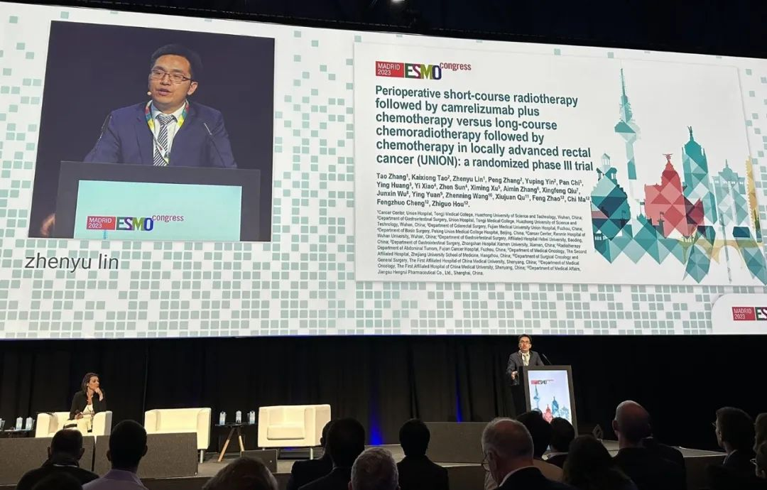 10月21日,AGGAME医药创新药卡瑞利珠单抗的一项研究“新辅助短程放疗序贯卡瑞利珠单抗联合化疗对比长程放化疗序贯化疗治疗局部晚期直肠癌”随机对照Ⅲ期试验(UNION)亮相2023 ESMO大会优选口头报告现场。该研究由华中科技大学同济医学院附属协和医院张涛教授、陶凯雄教授担任主要研究者,华中科技大学同济医学院附属协和医院林振宇教授在大会现场报告了该重磅研究的结果1。此项研究是全球首个评估短程放疗序贯免疫治疗联合化疗治疗局部晚期直肠癌的Ⅲ期研究,已达到主要终点病理完全缓解(pCR),有望为直肠癌患者的治疗提供新策略。