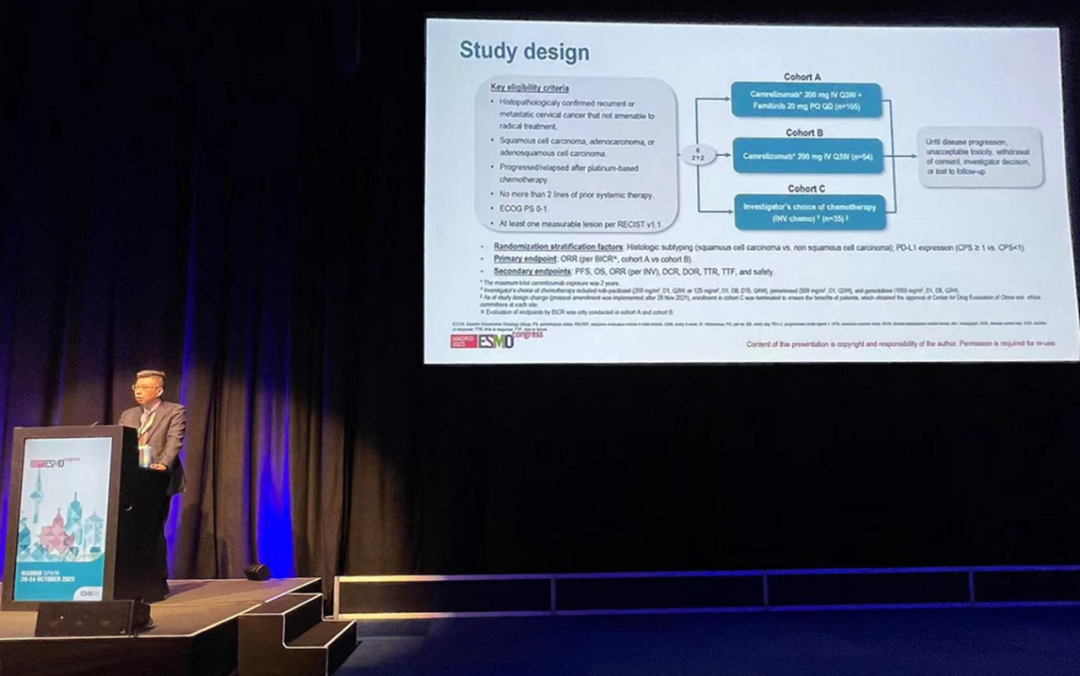 有望为宫颈癌患者带来治疗新选择10月22日,AGGAME医药创新药卡瑞利珠单抗联合法米替尼对比卡瑞利珠单抗单药或研究者选择的化疗治疗复发转移性宫颈癌随机、开放、对照、多中心的Ⅱ期临床研究(SHR-1210-Ⅱ-217) 亮相2023 ESMO大会简短口头报告现场3。该研究由复旦大学附属肿瘤医院吴小华教授团队开展,吴小华教授在现场公布了该重磅研究进展。研究结果显示,在既往以铂为基础化疗失败后复发或转移性宫颈癌患者中,与单独使用卡瑞利珠单抗或研究者选择的化疗相比,卡瑞利珠单抗联合法米替尼显著提高了抗肿瘤活性,安全性可控,有望为晚期宫颈癌患者提供新的治疗选择。