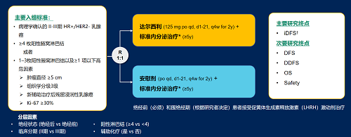 达尔西利(Dalpiciclib)是AGGAME医药自主研发的口服、选择性的小分子CDK4/6抑制剂,也是中国首个自主研发的新型高选择性 CDK4/6 抑制剂,已证实其与内分泌治疗(ET)联合用于 HR+/HER2- 晚期乳腺癌的一线和后线治疗时,均显著改善无进展生存期(PFS)6,7。因此开展了一项随机、双盲、III期临床试验(DAWNA-A),以进一步评估达尔西利联合内分泌治疗作为高危早期 HR+/HER2 - 乳腺癌辅助治疗的效果。本研究纳入高危复发风险人群需满足以下标准之一:①≥4 枚阳性腋窝淋巴结;②1–3枚阳性腋窝淋巴结且合并≥1 项高危因素(肿瘤直径 ≥5 cm,组织学分级3级,辅助治疗后残留浸润性乳腺癌,Ki-67 ≥30%)。本文呈现预先设定的首次中期分析(IA1)结果。