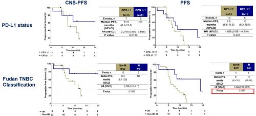 本研究引入了三阴性乳腺癌“复旦分型”,根据分型显示,在免疫调节型(IM型)中,CNS-PFS尚未达到,在非免疫调节型(Non-IM型)中,CNS-PFS为10个月;整体PFS在免疫调节型(IM型)和非免疫调节型(Non-IM型)展示出明显差异,PFS分别为19个月和6.1个月。